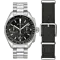 De zilverkleurige schakelband wordt geleverd met een extra zwarte lederen band, beide eenvoudig verwisselbaar dankzij het quick-release systeem. Of je nu kiest voor klassiek staal of sportief leer, de Lunar Pilot past zich moeiteloos aan jouw stijl aan.