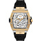 De multicolor horlogekast van roestvrij staal in combinatie met een zilverkleurige wijzerplaat en zwarte siliconen band creëert een unieke look. De kast van 44 mm en een dikte van 12,8 mm maakt het horloge fors en stoer. Het skeletdesign van de wijzerplaat toont delen van het binnenwerk, wat een industriële uitstraling geeft.