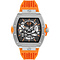 Het automatische uurwerk functioneert zonder batterij door het overslaan van energie via beweging. Zo blijft het horloge continu in bedrijf zolang het regelmatig gedragen wordt. Het opengewerkte design onthult interne componenten zoals tandwielen en balans, wat zorgt voor een technische en visuele beleving.