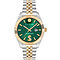 De groene guilloché-wijzerplaat geeft het horloge textuur en karakter, terwijl de kristallen op de bezel een subtiele toevoeging van luxe brengen. De twee‑kleurige metalen band sluit harmonieus aan bij de kast en draagt comfortabel rond de pols. Het hele ontwerp getuigt van oog voor detail en gevoel voor esthetiek.