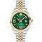 De bicolor afwerking in de kast en band biedt een elegante combinatie van tinten, die wordt versterkt door de levendige groene wijzerplaat. De contrastkleur zorgt voor visuele aantrekkingskracht, terwijl het geheel harmonieus blijft in uitstraling. De metalen band sluit comfortabel om de pols en complementeert de kast perfect qua uitstraling en gevoel.