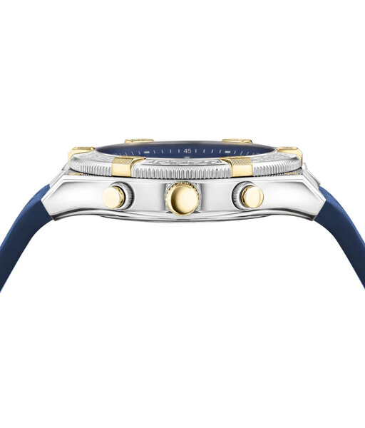 De zwarte edelstalen kast van 46 mm geeft dit horloge een stoere en mannelijke uitstraling. In combinatie met de blauwe wijzerplaat en de luxueuze leren band ontstaat er een spannend contrast dat direct in het oog springt. De subtiele Greca-accenten en het iconische Versace-logo zorgen voor een herkenbare en stijlvolle signatuur.